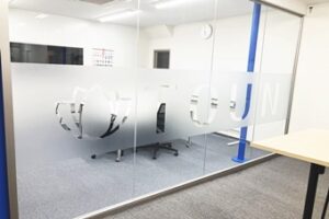 スリガラス・梁りの事例です 透明のガラスに摺りガラスシートを貼るサービス企業ロゴや絵柄の形状で切り抜きの可能で、 ガラス全部を隠さない事で、中の様子が多少見えるのがポイントです。 デザインから承ります。
